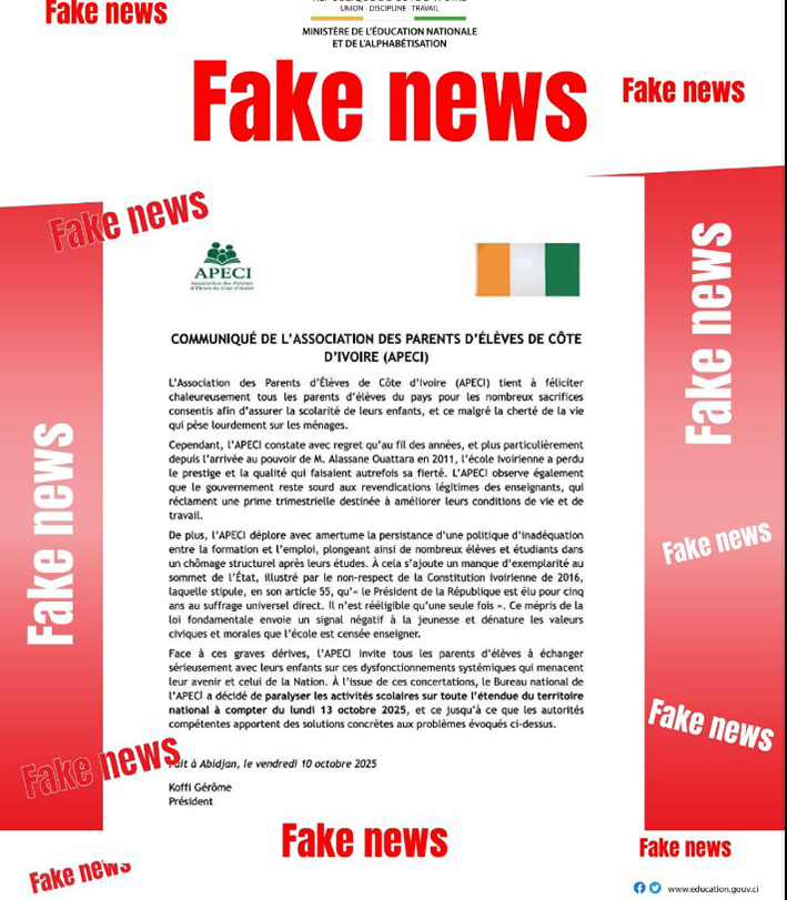 Dans un communiqué signé depuis le vendredi 10 octobre 2025 par Koffi Gérôme, qui se présente comme le président de l’Association des parents d’élèves de Côte d’Ivoire (APECI), ce dernier appelle tous les parents d’élèves à paralyser l’école ivoirienne dans son ensemble dès ce lundi 13 octobre 2025. Cette information a été démentie par le Ministère de l’Education et l’alphabétisation comme étant un ‘‘fake news’’.