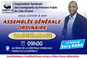 Demain samedi 20 décembre 2025 se tiendra au siège de la centrale syndicale, Fédération des syndicats autonomes de Côte d’Ivoire – Confédération générale (FESACI-CG) sis à la Riviera 2, à Abidjan, dans la commune de Cocody, une assemblée générale ordinaire de l’Organisation syndicale des enseignants du primaire public de Côte d’Ivoire (OSEPPCI) dirigée par le secrétaire général national Kaba Sory.