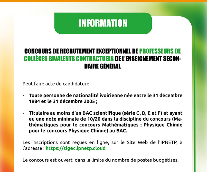S’agissant des professeurs de collèges bivalents contractuels, les candidats doivent également être ivoiriens, être nés entre le 31 décembre 1984 et le 31 décembre 2005, détenir au minimum un baccalauréat scientifique (séries C, D, E ou F) et avoir obtenu une note d’au moins 10/20 dans la discipline concernée (mathématiques ou physique-chimie) lors de l’examen du baccalauréat.